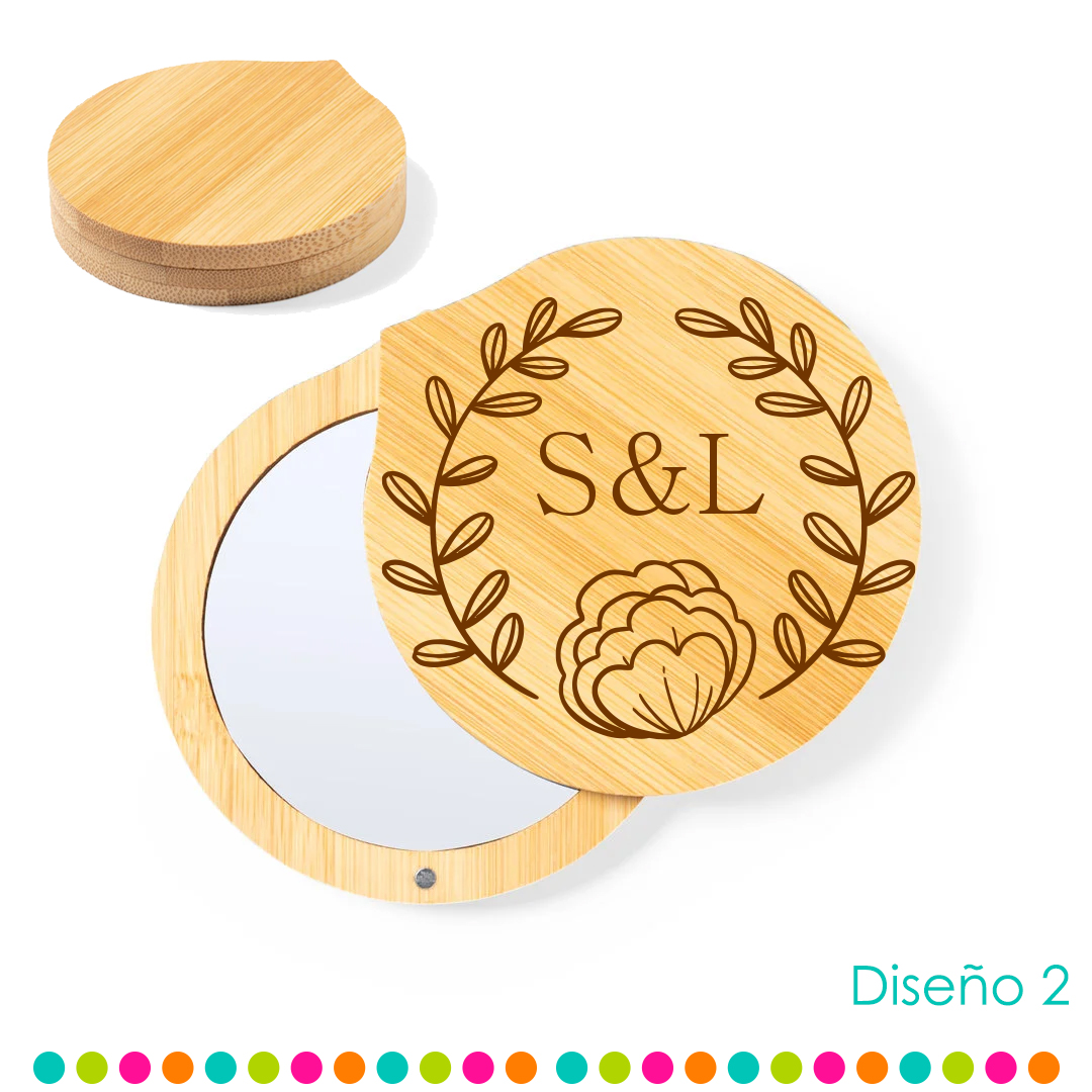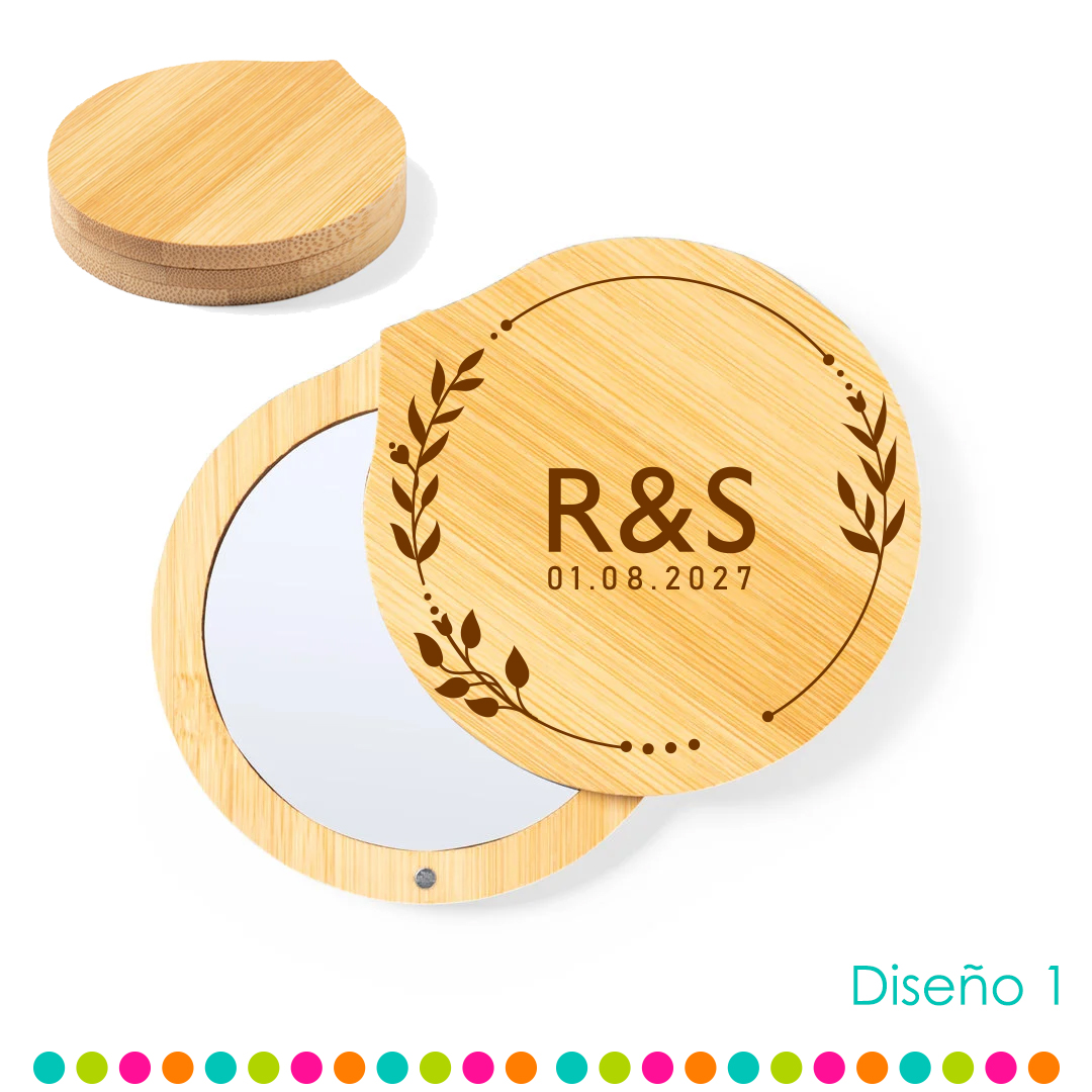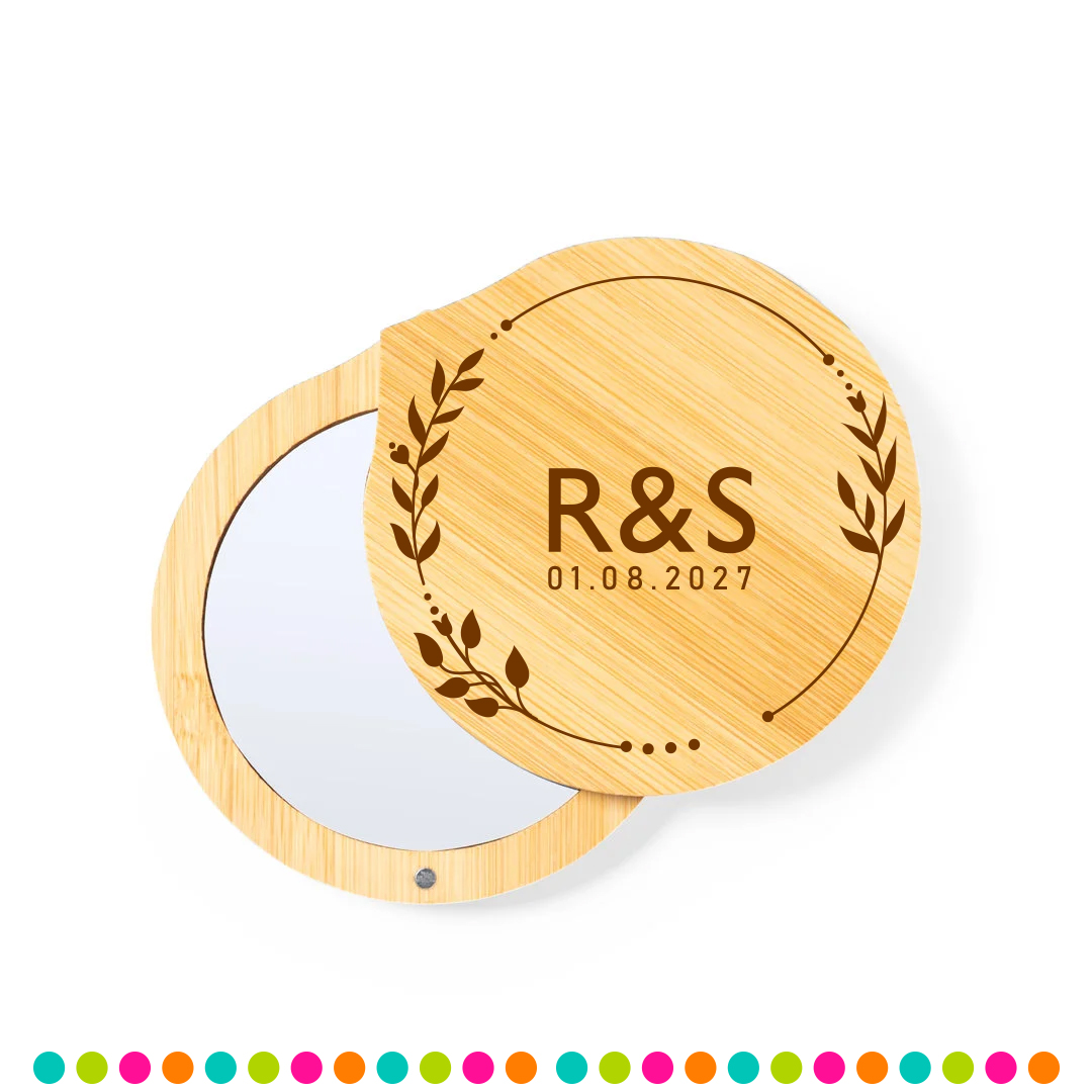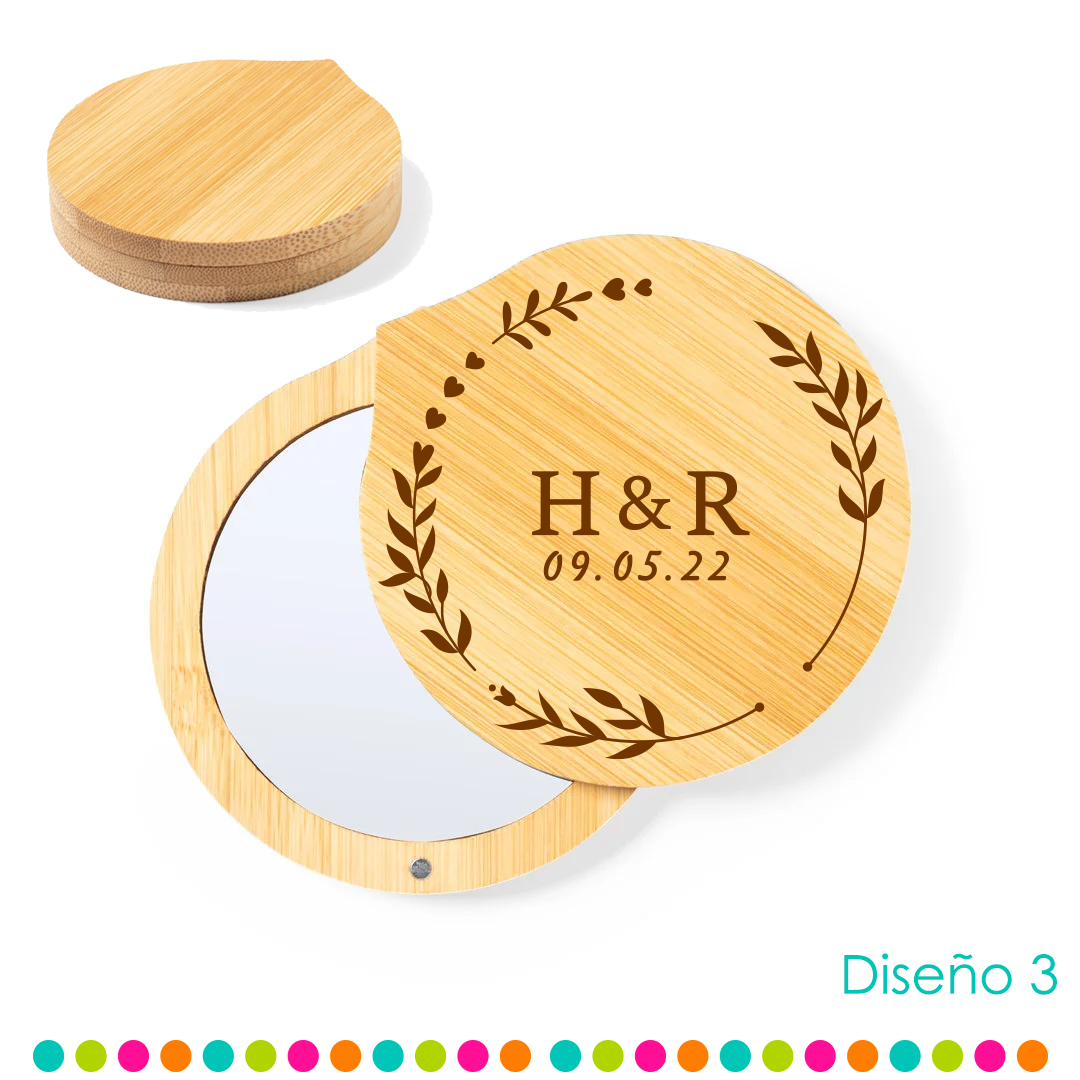 Espejo con tapa giratoria imantada de bambú, halaga a tus invitados con un recuerdo funcional, es bonito y único. Este espejo de bambú es la selección perfecta para que recuerden esa fecha especial. No solo son prácticos y elegantes, si no que reflejarán también tu compromiso con el medio ambiente al estar libres de plásticos. Un detalle que tus invitados apreciarán y utilizarán de forma diaria.