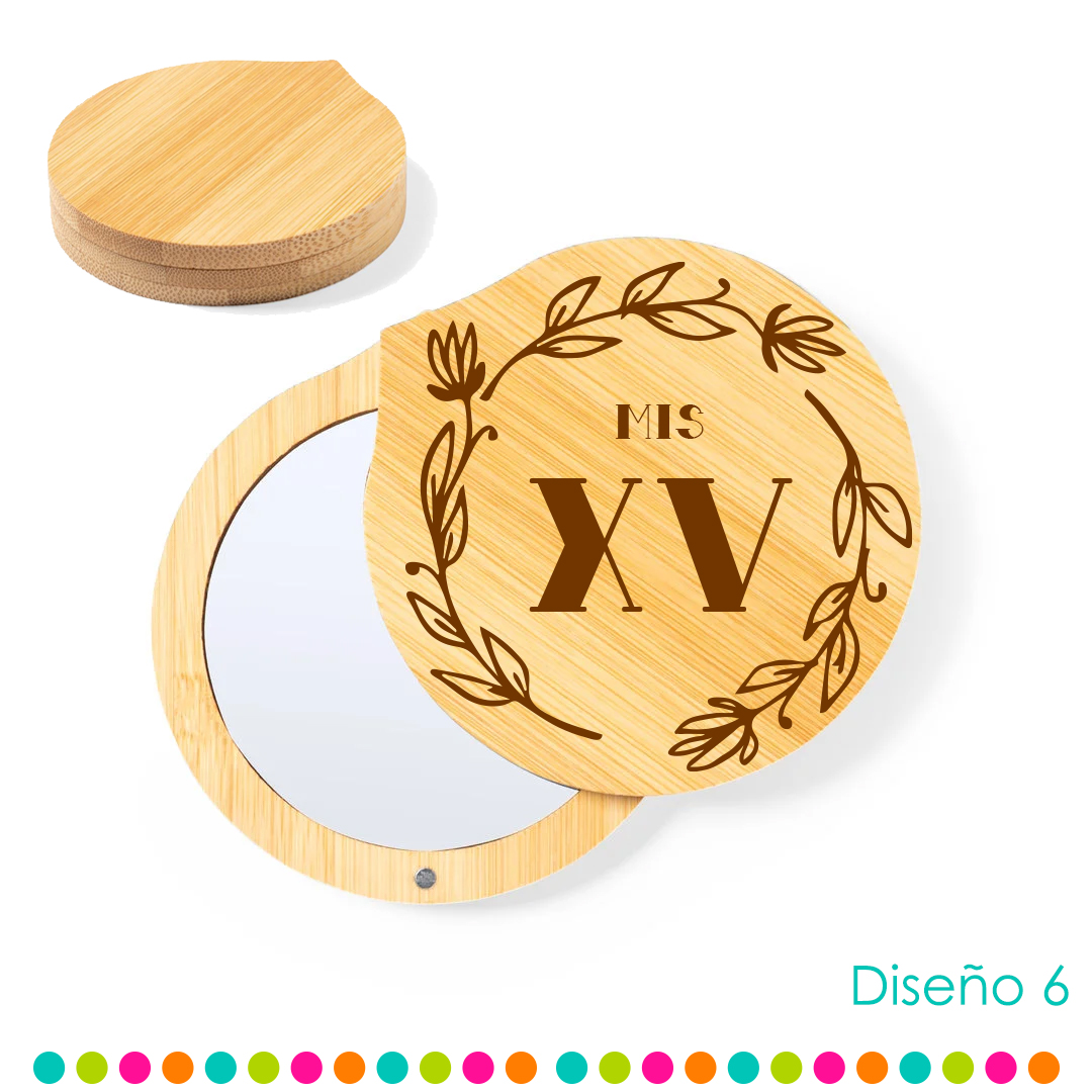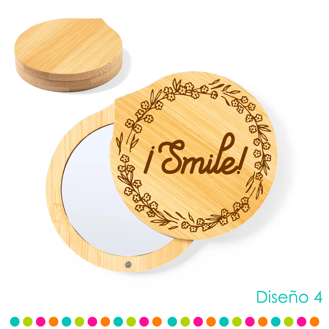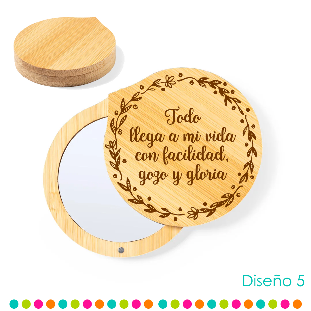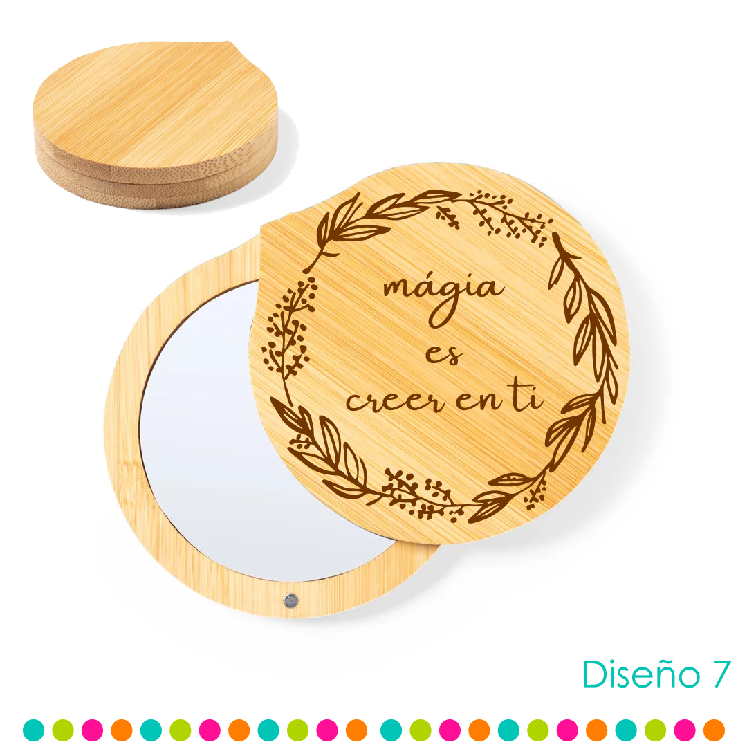 Espejo con tapa giratoria imantada de bambú, halaga a tus invitados con un recuerdo funcional, es bonito y único. Este espejo de bambú es la selección perfecta para que recuerden esa fecha especial. No solo son prácticos y elegantes, si no que reflejarán también tu compromiso con el medio ambiente al estar libres de plásticos. Un detalle que tus invitados apreciarán y utilizarán de forma diaria.